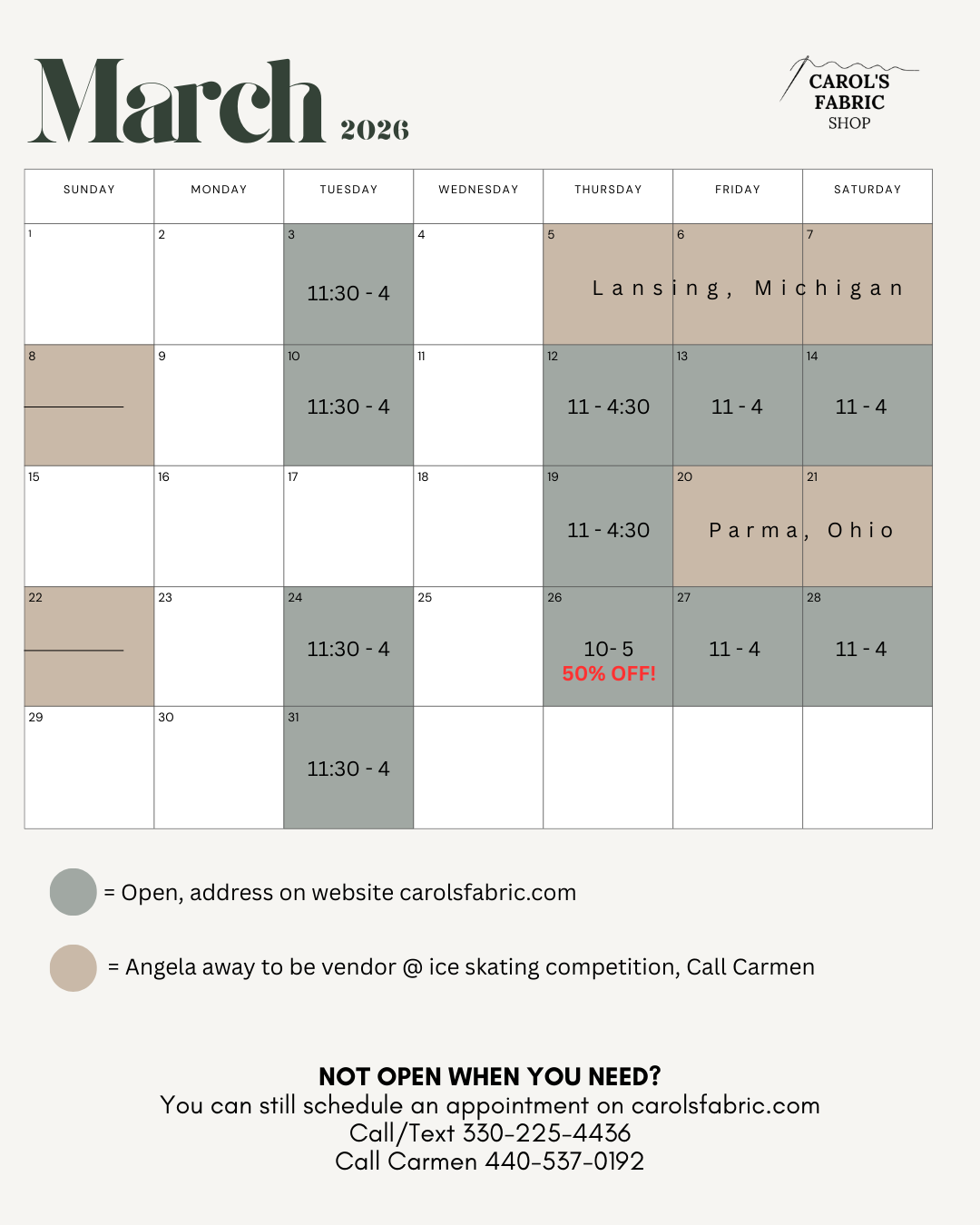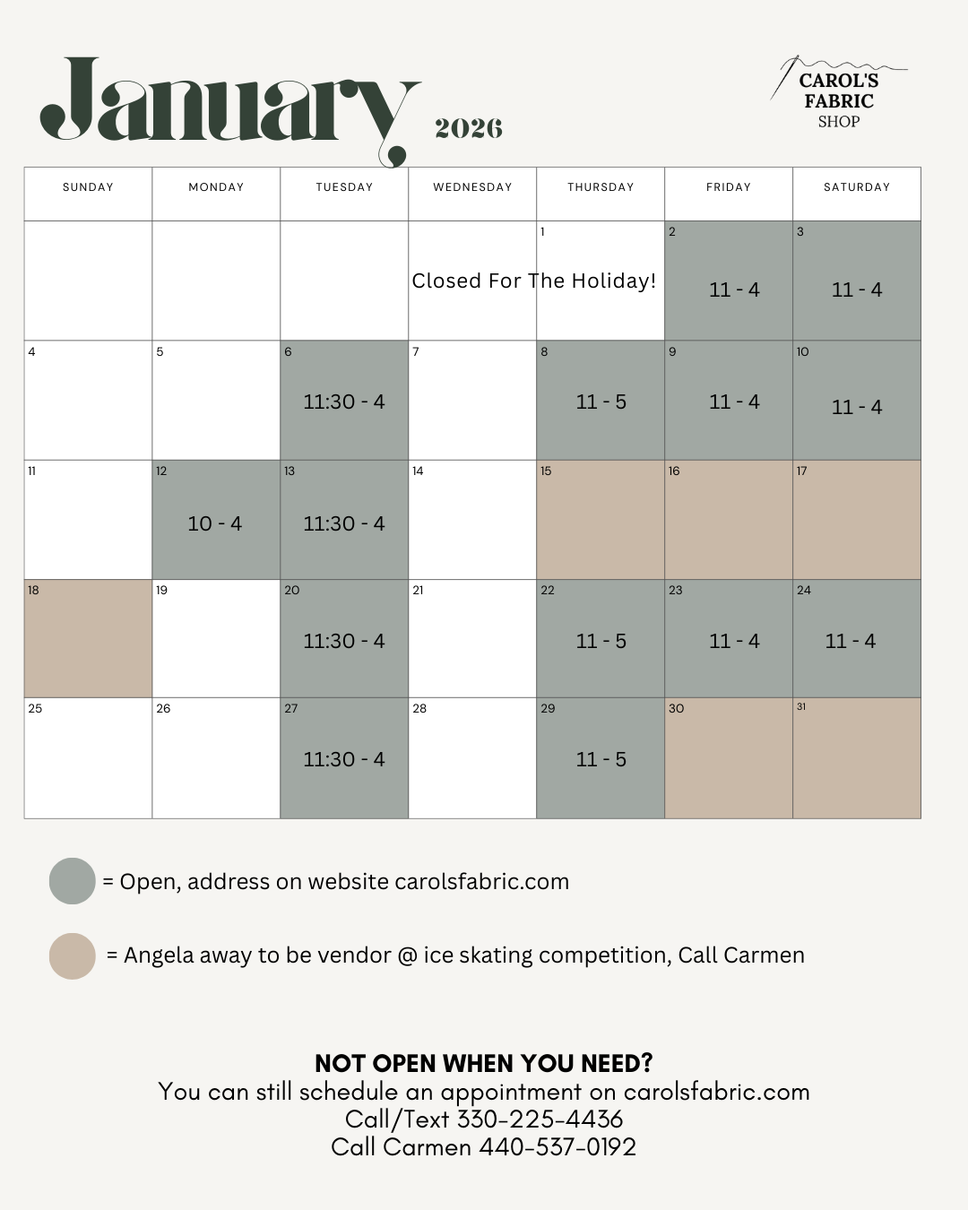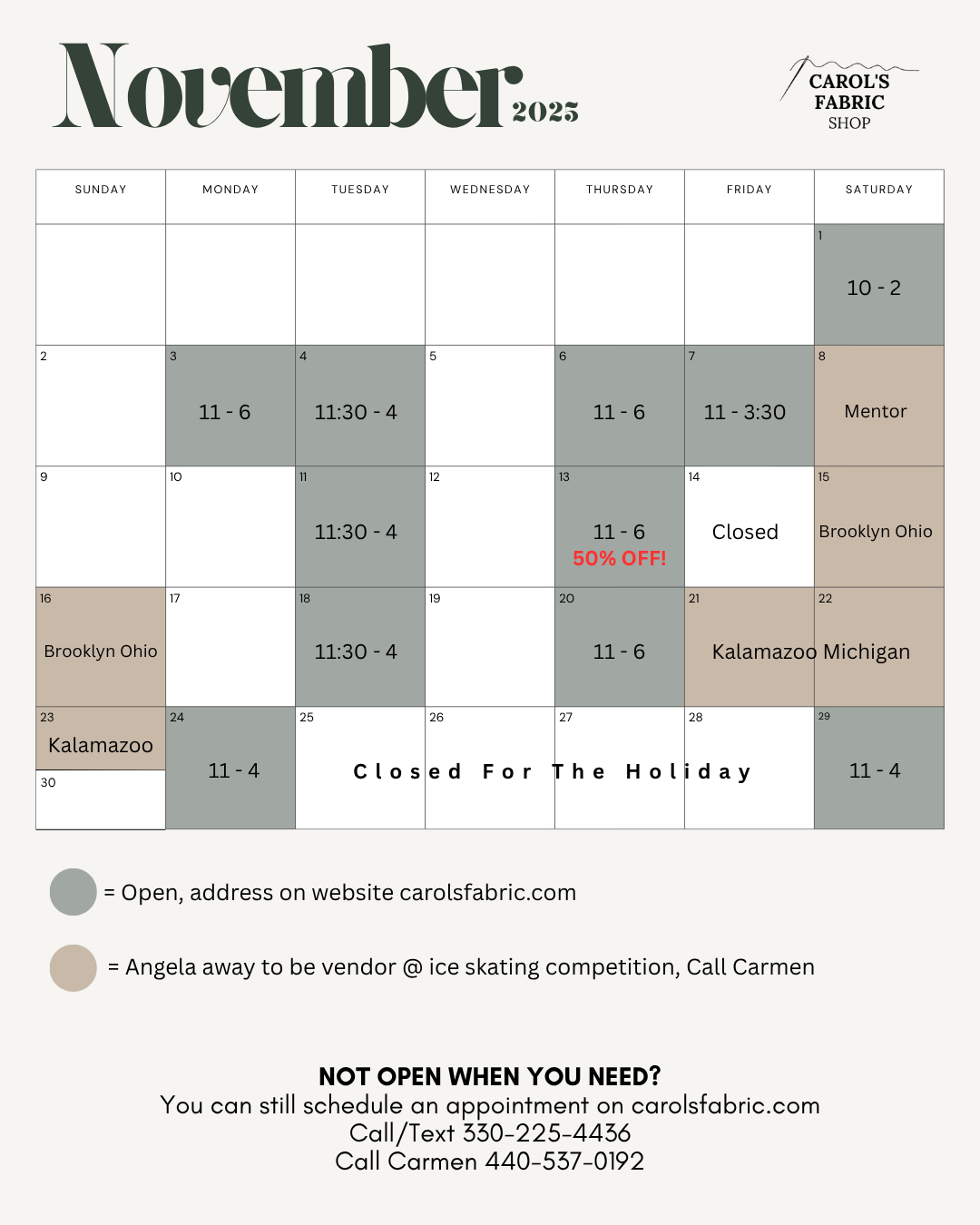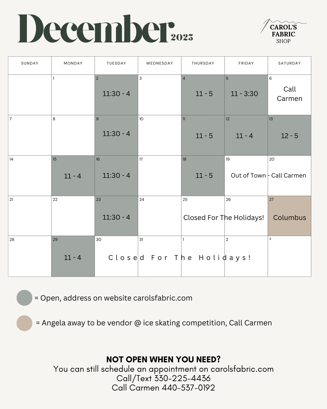 Our store front on North Carpenter Road is officially closed! You can find our warehouse address along with our open hours calendar below. You are also welcome to shop by using the appointment calendar at the bottom of this page, calling Carmen at 440-537-0192, calling/texting the store phone at 330-225-4436, or emailing us at info@carolsfabric.com